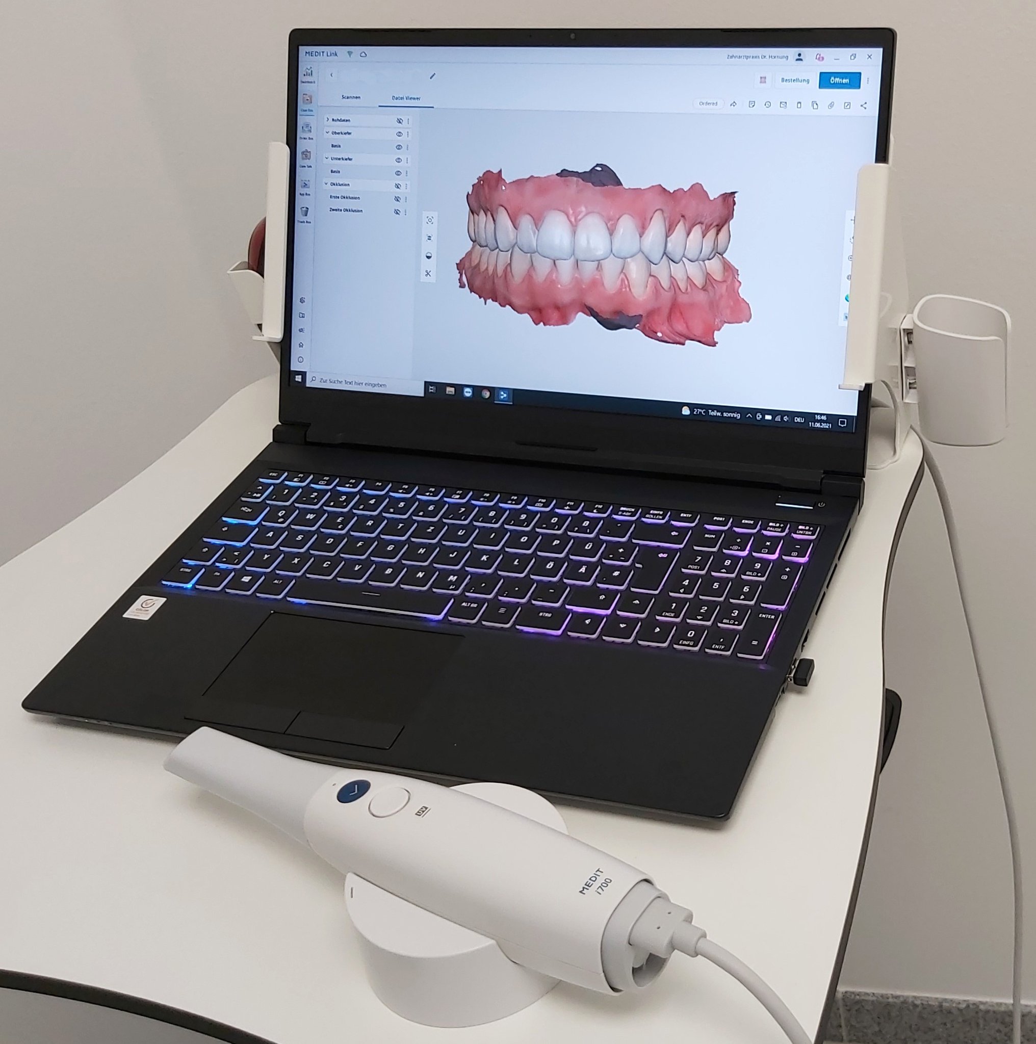 Komfortabler und fortschrittlicher ist hier die digitale Abdrucknahme. Die Zähne werden lediglich mit einem 3D-Scanner optisch abgetastet. Das dauert nur wenige Sekunden und verursacht keinen